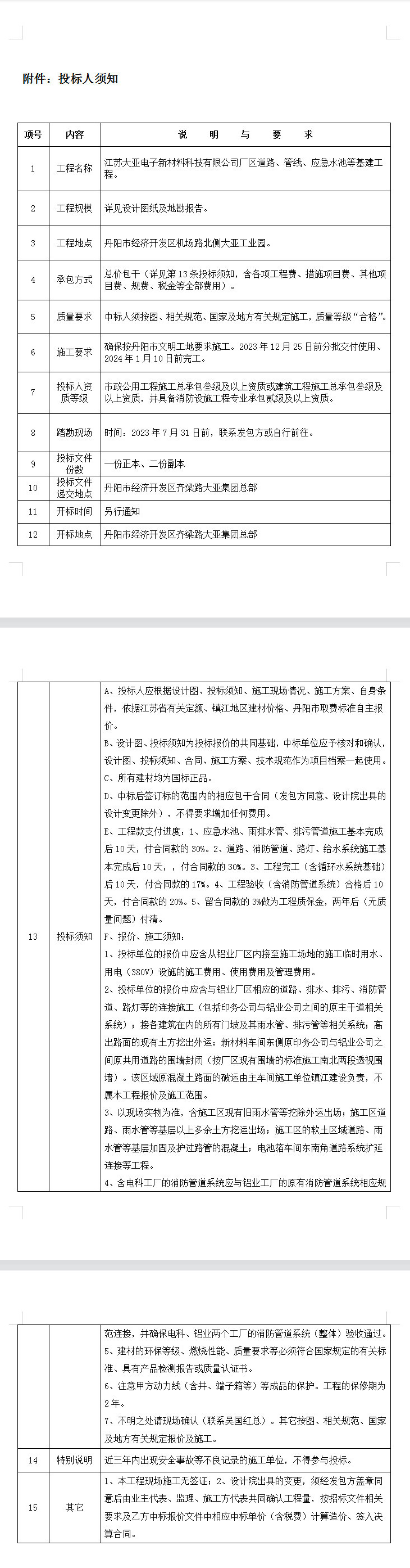 本招標項目 廠區(qū)道路、管線、應急水池等基建工程 已批準建設,招標人為 江蘇大亞電子新材料科技有限公司 ,建設資金來自 自籌 。項目已具備招標條件,現(xiàn)進行公開招標,特邀請有興趣的潛在投標人(以下簡稱申請人)提出資格預審申請。