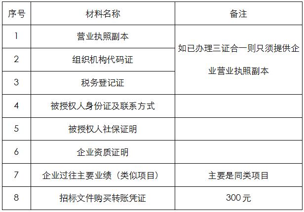 2、凡有意向參加投標者,請在上述期間內按下表提供報名資料,相關證明文件的原件如無法提供原件則提供復印件加蓋公司公章,投標人須將上述資料的掃描件發郵件至招標聯系人處進行報名。