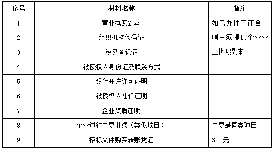 2、 凡有意向參加投標者,請在上述期間內按下表提供報名資料,相關證明文件的原件如無法提供原件則提供復印件加蓋公司公章,投標人須將上述資料的掃描件發郵件至招標聯系人處進行報名。