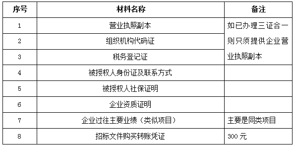 2、 凡有意向參加投標(biāo)者,請在上述期間內(nèi)按下表提供報名資料,相關(guān)證明文件的原件如無法提供原件則提供復(fù)印件加蓋公司公章,投標(biāo)人須將上述資料的掃描件發(fā)郵件至招標(biāo)聯(lián)系人處進(jìn)行報名。