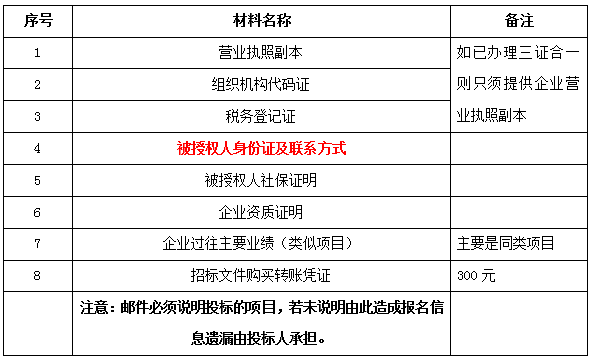 2、 凡有意向參加投標者,請在上述期間內按下表提供報名資料,相關證明文件的原件如無法提供原件則提供復印件加蓋公司公章,投標人須將上述資料的掃描件發郵件至招標聯系人處進行報名。