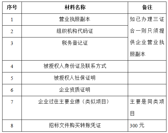 2、 凡有意向參加投標(biāo)者,請在上述期間內(nèi)按下表提供報名資料,相關(guān)證明文件的原件如無法提供原件則提供復(fù)印件加蓋公司公章,投標(biāo)人須將上述資料的掃描件發(fā)郵件至招標(biāo)聯(lián)系人處進(jìn)行報名。