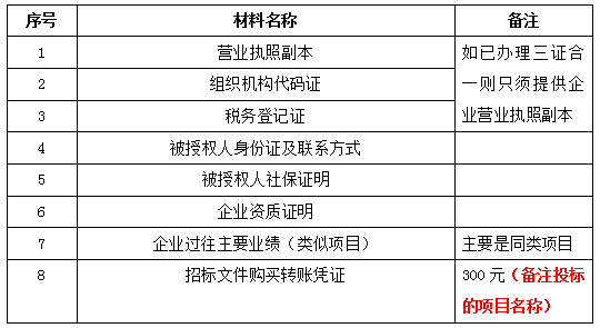 2、 凡有意向參加投標者,請在上述期間內按下表提供報名資料,相關證明文件的原件如無法提供原件則提供復印件加蓋公司公章,投標人須將上述資料的掃描件發郵件至招標聯系人處進行報名。