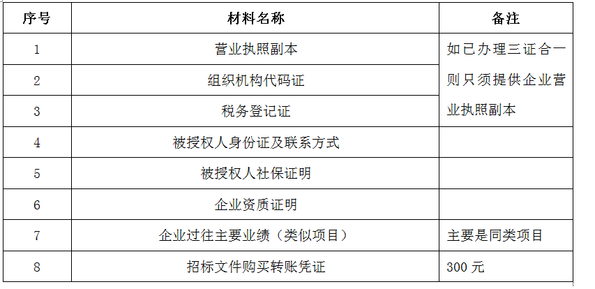 4、 獲取時(shí)間為本招標(biāo)公告截止后,由招標(biāo)人統(tǒng)一發(fā)放,本公告公示期間為:2020年9月28日12時(shí)起至2020年10月3日12時(shí)。凡有意向參加投標(biāo)者,請(qǐng)?jiān)谏鲜銎陂g內(nèi)按下表提供報(bào)名資料,相關(guān)證明文件的原件如無(wú)法提供原件則提供復(fù)印件加蓋公司公章,投標(biāo)人須將上述資料的掃描件發(fā)郵件至招標(biāo)聯(lián)系人處進(jìn)行報(bào)名。