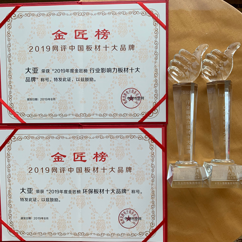 在9月2日晚舉行的中國(guó)木業(yè)網(wǎng)2019中國(guó)板材“金匠榜”網(wǎng)絡(luò)評(píng)選活動(dòng)頒獎(jiǎng)典禮上,大亞人造板又榮獲“行業(yè)影響力板材十大品牌”及“環(huán)保板材十大品牌”兩項(xiàng)殊榮,這是對(duì)大亞人造板的行業(yè)影響力和堅(jiān)持綠色環(huán)保理念的肯定。