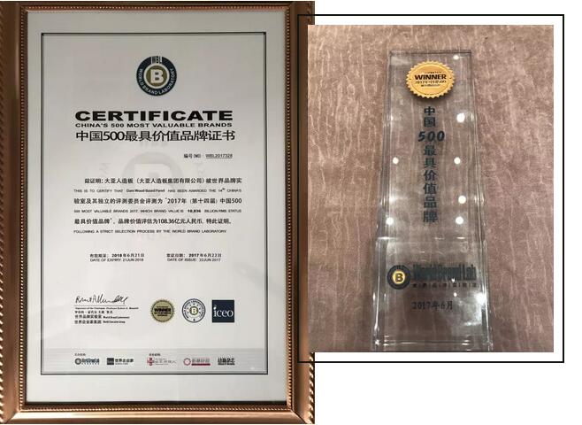 6月22日,由國際權威品牌評審機構——世界品牌實驗室(World Brand Lab)主辦的“世界品牌大會”暨“2017年(第十四屆)中國500最具價值品牌”發布會在北京舉行,會上發布了2017 年“中國500 最具價值品牌”排行榜。在這份基于財務數據、品牌強度和消費者行為分析的年度報告中,大亞人造板以108.36億元人民幣的品牌價值榮登人造板行業榜首!