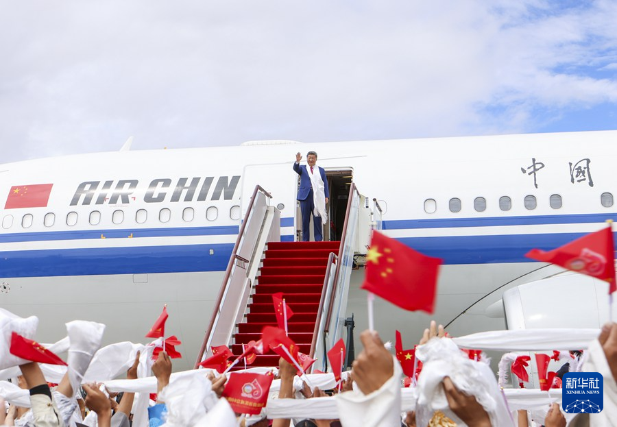 習近平離開西藏時,各族群眾紛紛來到拉薩市區的沿途道路兩旁,揮舞紅旗、手捧哈達,歡呼著向總書記問好,向總書記表達由衷的愛戴。拉薩貢嘎機場,身著節日盛裝的干部群眾揮舞著紅旗和花束,載歌載舞,高喊“扎西德勒”,表達高原兒女對以習近平同志為核心的黨中央的感激之情、對建設社會主義現代化新西藏的堅定信心。